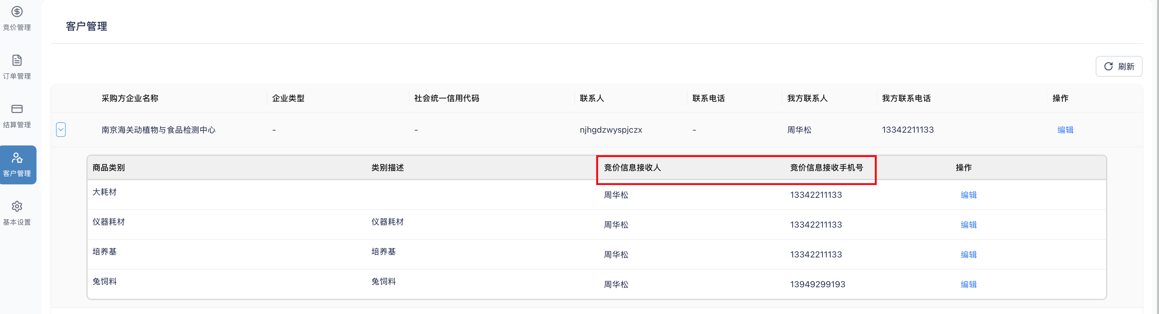 如果供应商内部管理精细化,可以为采购人的每一个商品分类分别维护对应的联系人和联系方式。 短信提醒以商品分类的联系人为准。如下图: